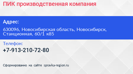 ПИК, производственная компания по адресу 630096, Новосибирская область, Новосибирск, Станционная, 60/1 к85 в дальнейшем Организация, размещена в следующих категориях: