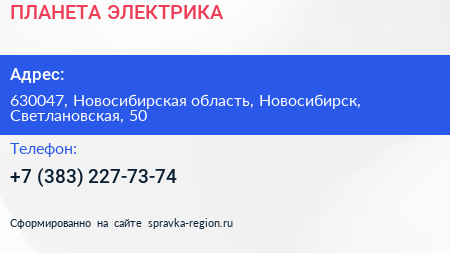 ПЛАНЕТА ЭЛЕКТРИКА по адресу 630047, Новосибирская область, Новосибирск, Светлановская, 50 в дальнейшем Организация, размещена в следующих категориях: