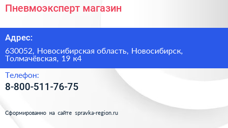 Пневмоэксперт, магазин по адресу 630052, Новосибирская область, Новосибирск, Толмачёвская, 19 к4 в дальнейшем Организация, размещена в следующих категориях: