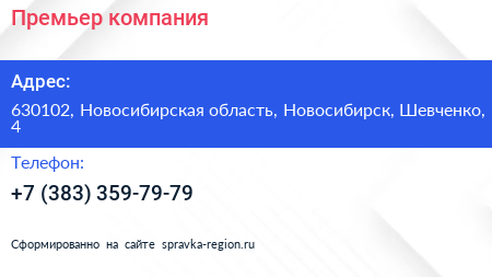 Премьер, компания по адресу 630102, Новосибирская область, Новосибирск, Шевченко, 4 в дальнейшем Организация, размещена в следующих категориях: