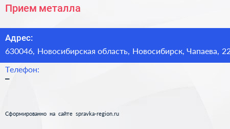 Прием металла по адресу 630046, Новосибирская область, Новосибирск, Чапаева, 22 в дальнейшем Организация, размещена в следующих категориях: