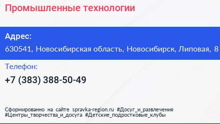 Промышленные технологии по адресу 630541, Новосибирская область, Новосибирск, Липовая, 8 в дальнейшем Организация, размещена в следующих категориях: