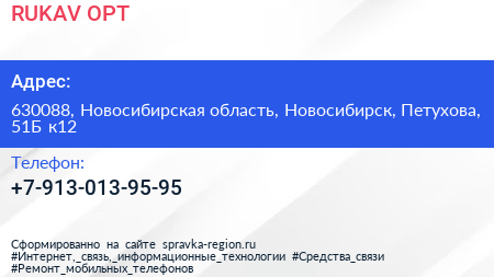 RUKAV-OPT по адресу 630088, Новосибирская область, Новосибирск, Петухова, 51Б к12 в дальнейшем Организация, размещена в следующих категориях: