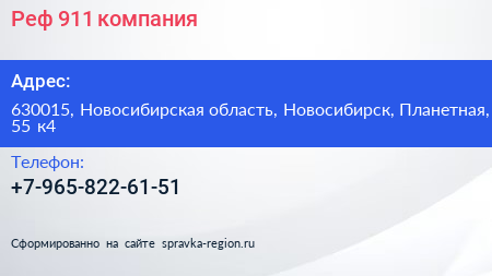 Реф-911, компания по адресу 630015, Новосибирская область, Новосибирск, Планетная, 55 к4 в дальнейшем Организация, размещена в следующих категориях:
