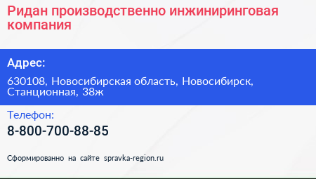 Ридан, производственно-инжиниринговая компания по адресу 630108, Новосибирская область, Новосибирск, Станционная, 38ж в дальнейшем Организация, размещена в следующих категориях: