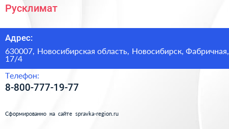 Русклимат по адресу 630007, Новосибирская область, Новосибирск, Фабричная, 17/4 в дальнейшем Организация, размещена в следующих категориях: