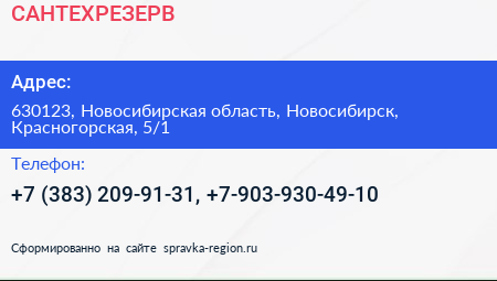 САНТЕХРЕЗЕРВ по адресу 630123, Новосибирская область, Новосибирск, Красногорская, 5/1 в дальнейшем Организация, размещена в следующих категориях: