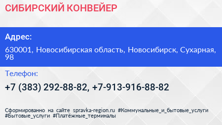 СИБИРСКИЙ КОНВЕЙЕР по адресу 630001, Новосибирская область, Новосибирск, Сухарная, 98 в дальнейшем Организация, размещена в следующих категориях: