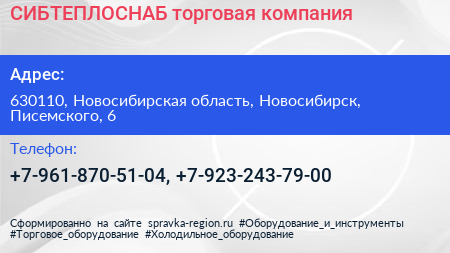 СИБТЕПЛОСНАБ, торговая компания по адресу 630110, Новосибирская область, Новосибирск, Писемского, 6 в дальнейшем Организация, размещена в следующих категориях: