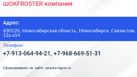 ШОКFROSTER, компания по адресу 630120, Новосибирская область, Новосибирск, Связистов, 12а к14 в дальнейшем Организация, размещена в следующих категориях: