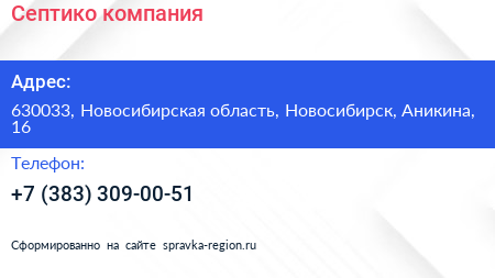 Септико, компания по адресу 630033, Новосибирская область, Новосибирск, Аникина, 16 в дальнейшем Организация, размещена в следующих категориях: