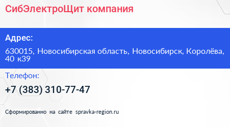 СибЭлектроЩит, компания по адресу 630015, Новосибирская область, Новосибирск, Королёва, 40 к39 в дальнейшем Организация, размещена в следующих категориях: