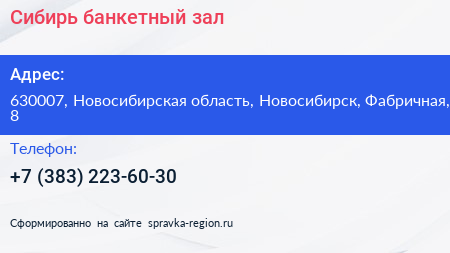 Сибирь, банкетный зал по адресу 630007, Новосибирская область, Новосибирск, Фабричная, 8 в дальнейшем Организация, размещена в следующих категориях: