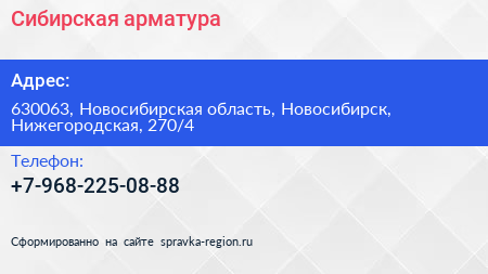 Сибирская арматура по адресу 630063, Новосибирская область, Новосибирск, Нижегородская, 270/4 в дальнейшем Организация, размещена в следующих категориях: