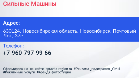 Сильные Машины по адресу 630124, Новосибирская область, Новосибирск, Почтовый Лог, 37е в дальнейшем Организация, размещена в следующих категориях: