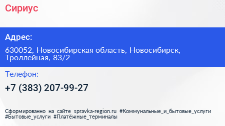 Сириус по адресу 630052, Новосибирская область, Новосибирск, Троллейная, 83/2 в дальнейшем Организация, размещена в следующих категориях: