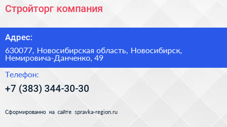 Для связи с организацией воспользуйтесь номером телефона: +7 (383) 344-30-30. Пн: c 08:30-17:30, Вт: c 08:30-17:30, Ср: c 08:30-17:30, Чт: c 08:30-17:30, Пт: c 08:30-17:30, Сб: выходной, Вс: выходной, вы можете обратиться в эту организацию.