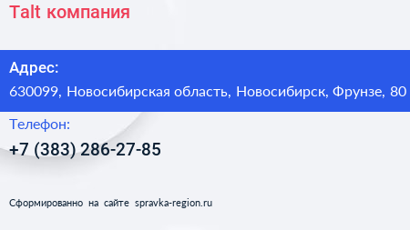 Talt, компания по адресу 630099, Новосибирская область, Новосибирск, Фрунзе, 80 в дальнейшем Организация, размещена в следующих категориях:
