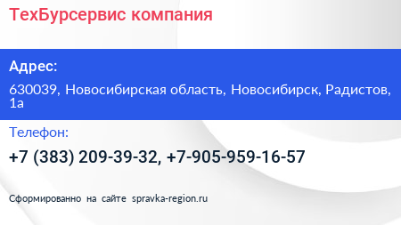 ТехБурсервис, компания по адресу 630039, Новосибирская область, Новосибирск, Радистов, 1а в дальнейшем Организация, размещена в следующих категориях:
