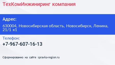 ТехКомИнжиниринг, компания по адресу 630004, Новосибирская область, Новосибирск, Ленина, 21/1 к1 в дальнейшем Организация, размещена в следующих категориях: