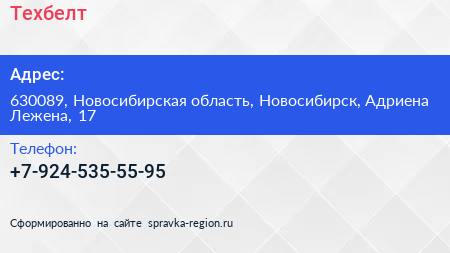 Техбелт по адресу 630089, Новосибирская область, Новосибирск, Адриена Лежена, 17 в дальнейшем Организация, размещена в следующих категориях: