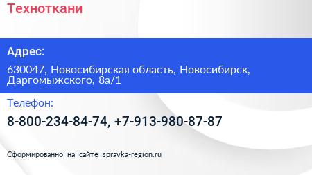 Техноткани по адресу 630047, Новосибирская область, Новосибирск, Даргомыжского, 8а/1 в дальнейшем Организация, размещена в следующих категориях: