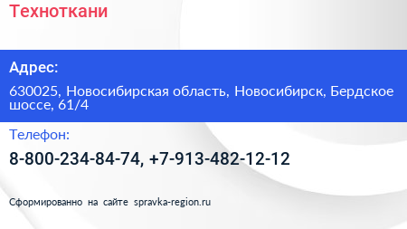 Техноткани по адресу 630025, Новосибирская область, Новосибирск, Бердское шоссе, 61/4 в дальнейшем Организация, размещена в следующих категориях: