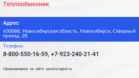 Теплообменник по адресу 630088, Новосибирская область, Новосибирск, Северный проезд, 28 в дальнейшем Организация, размещена в следующих категориях: