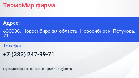 ТермоМир, фирма по адресу 630088, Новосибирская область, Новосибирск, Петухова, 71 в дальнейшем Организация, размещена в следующих категориях: