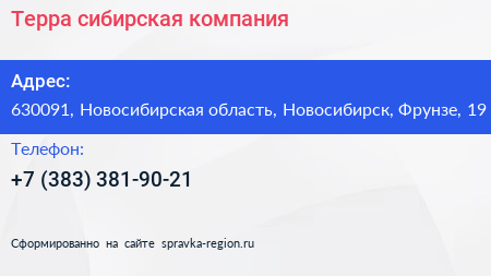 Терра, сибирская компания по адресу 630091, Новосибирская область, Новосибирск, Фрунзе, 19 в дальнейшем Организация, размещена в следующих категориях: