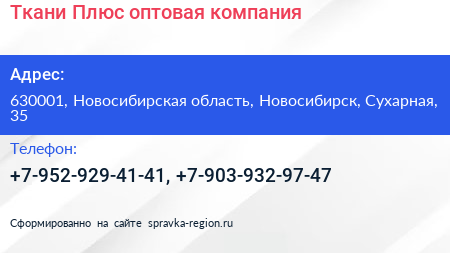 Ткани Плюс, оптовая компания по адресу 630001, Новосибирская область, Новосибирск, Сухарная, 35 в дальнейшем Организация, размещена в следующих категориях: