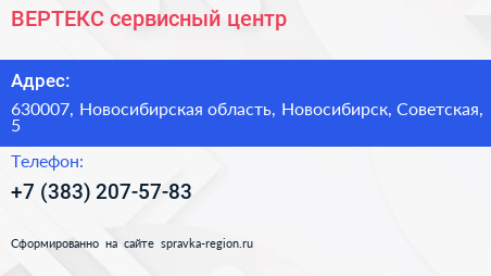 ВЕРТЕКС, сервисный центр по адресу 630007, Новосибирская область, Новосибирск, Советская, 5 в дальнейшем Организация, размещена в следующих категориях: