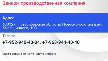 Ванком, производственная компания по адресу 630027, Новосибирская область, Новосибирск, Богдана Хмельницкого, 103 в дальнейшем Организация, размещена в следующих категориях: