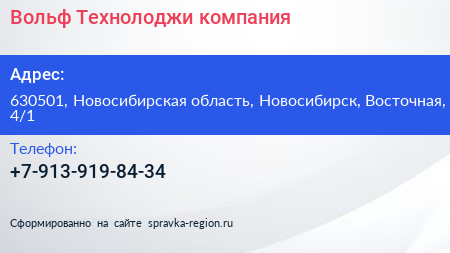 Вольф Технолоджи, компания по адресу 630501, Новосибирская область, Новосибирск, Восточная, 4/1 в дальнейшем Организация, размещена в следующих категориях: