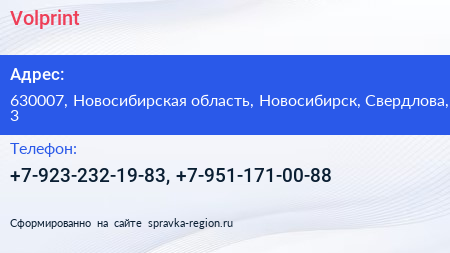 Volprint по адресу 630007, Новосибирская область, Новосибирск, Свердлова, 3 в дальнейшем Организация, размещена в следующих категориях: