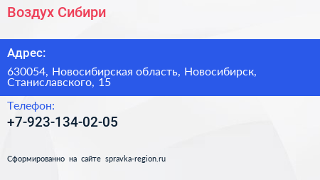 Воздух Сибири по адресу 630054, Новосибирская область, Новосибирск, Станиславского, 15 в дальнейшем Организация, размещена в следующих категориях: