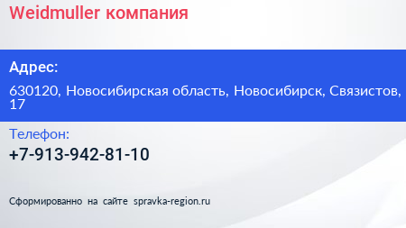 Weidmuller, компания по адресу 630120, Новосибирская область, Новосибирск, Связистов, 17 в дальнейшем Организация, размещена в следующих категориях: