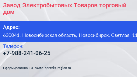 Завод Электробытовых Товаров, торговый дом по адресу 630041, Новосибирская область, Новосибирск, Светлая, 11 в дальнейшем Организация, размещена в следующих категориях: