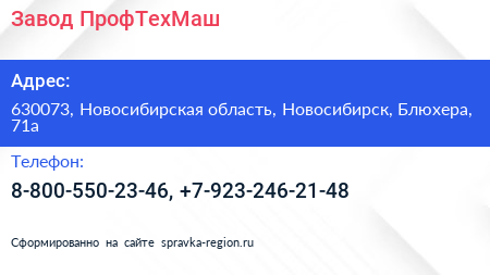 Завод ПрофТехМаш по адресу 630073, Новосибирская область, Новосибирск, Блюхера, 71а в дальнейшем Организация, размещена в следующих категориях: