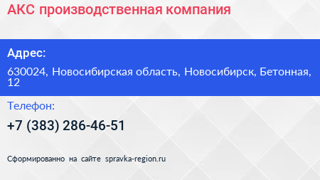 АКС, производственная компания по адресу 630024, Новосибирская область, Новосибирск, Бетонная, 12 в дальнейшем Организация, размещена в следующих категориях: