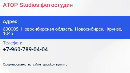ATOP Studios, фотостудия по адресу 630005, Новосибирская область, Новосибирск, Фрунзе, 104а в дальнейшем Организация, размещена в следующих категориях: