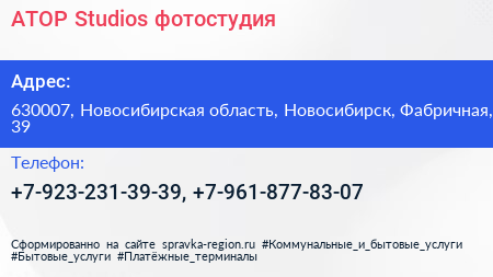 ATOP Studios, фотостудия по адресу 630007, Новосибирская область, Новосибирск, Фабричная, 39 в дальнейшем Организация, размещена в следующих категориях: