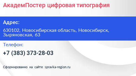 АкадемПостер, цифровая типография по адресу 630102, Новосибирская область, Новосибирск, Зыряновская, 63 в дальнейшем Организация, размещена в следующих категориях: