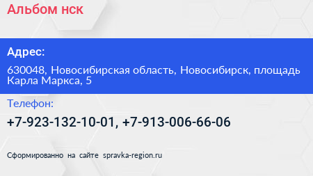 Альбом-нск по адресу 630048, Новосибирская область, Новосибирск, площадь Карла Маркса, 5 в дальнейшем Организация, размещена в следующих категориях: