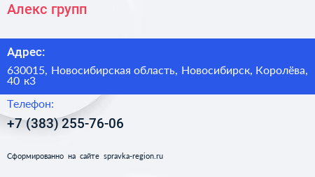 Алекс-групп по адресу 630015, Новосибирская область, Новосибирск, Королёва, 40 к3 в дальнейшем Организация, размещена в следующих категориях: