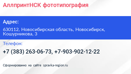 АллпринтНСК, фототипография по адресу 630112, Новосибирская область, Новосибирск, Кошурникова, 3 в дальнейшем Организация, размещена в следующих категориях: