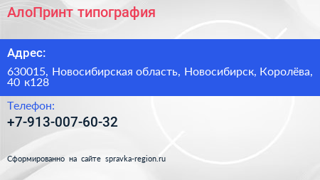 АлоПринт, типография по адресу 630015, Новосибирская область, Новосибирск, Королёва, 40 к128 в дальнейшем Организация, размещена в следующих категориях: