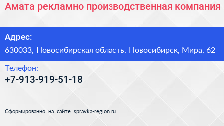 Амата, рекламно-производственная компания по адресу 630033, Новосибирская область, Новосибирск, Мира, 62 в дальнейшем Организация, размещена в следующих категориях: