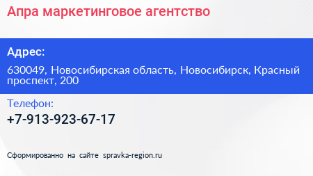 Апра, маркетинговое агентство по адресу 630049, Новосибирская область, Новосибирск, Красный проспект, 200 в дальнейшем Организация, размещена в следующих категориях: