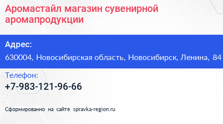 Аромастайл, магазин сувенирной аромапродукции по адресу 630004, Новосибирская область, Новосибирск, Ленина, 84 в дальнейшем Организация, размещена в следующих категориях: